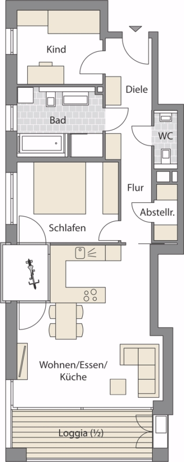 Ein besonderes Highlight ist die vielseitig nutzbare „Greenbox“ – ein verglaster Kubus, der Tageslicht tief in die Wohnung führt und vielfältige Nutzungsmöglichkeiten für Pflanzen, Fitness oder Meditation schafft. Die geschützte, überdachte Loggia erweitert den Wohnraum und bietet Raum für entspannte Stunden an der frischen Luft.